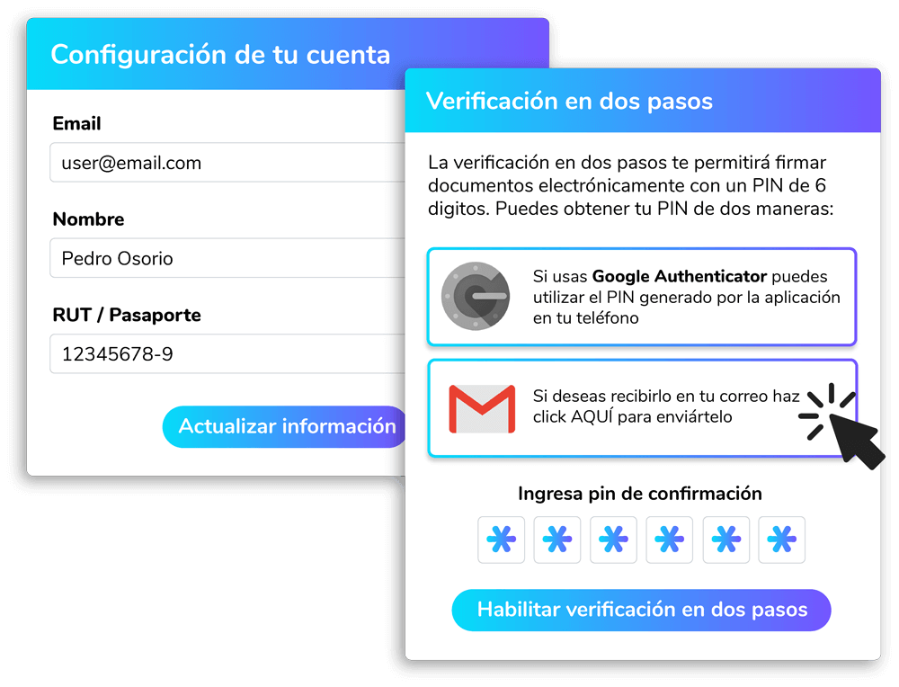 Si es tu primer ingreso confirma tus datos en Configurar mi cuenta y habilita la verificación de 2 pasos define el tipo de validación para confirmar.